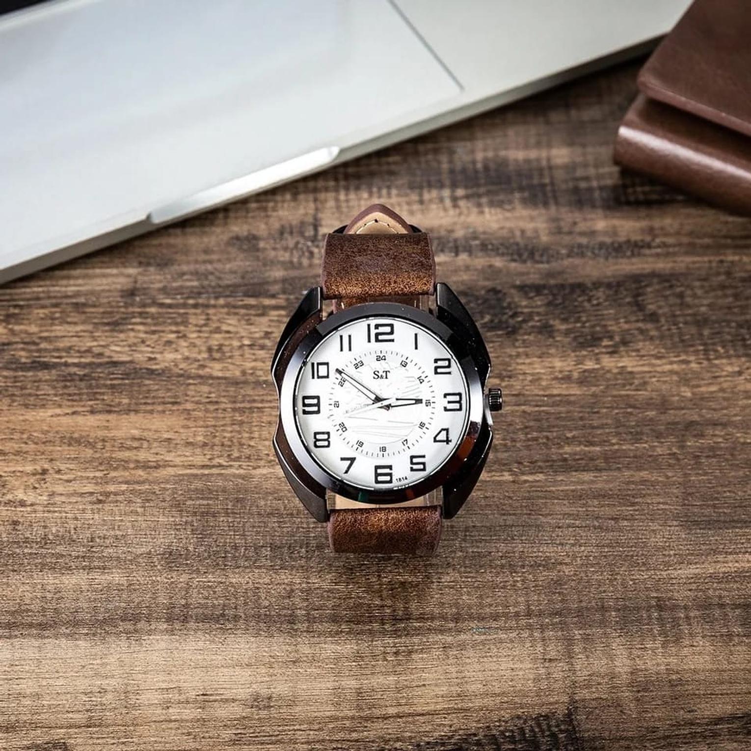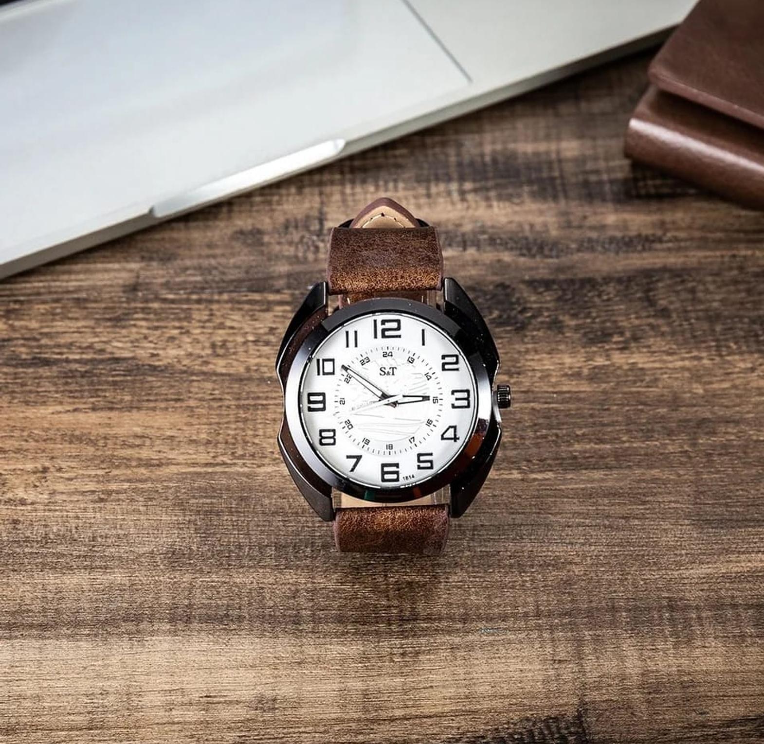 Durable Leather Strap: The watch is equipped with a premium dark brown leather band that offers both a comfortable fit and a classic masculine aesthetic.