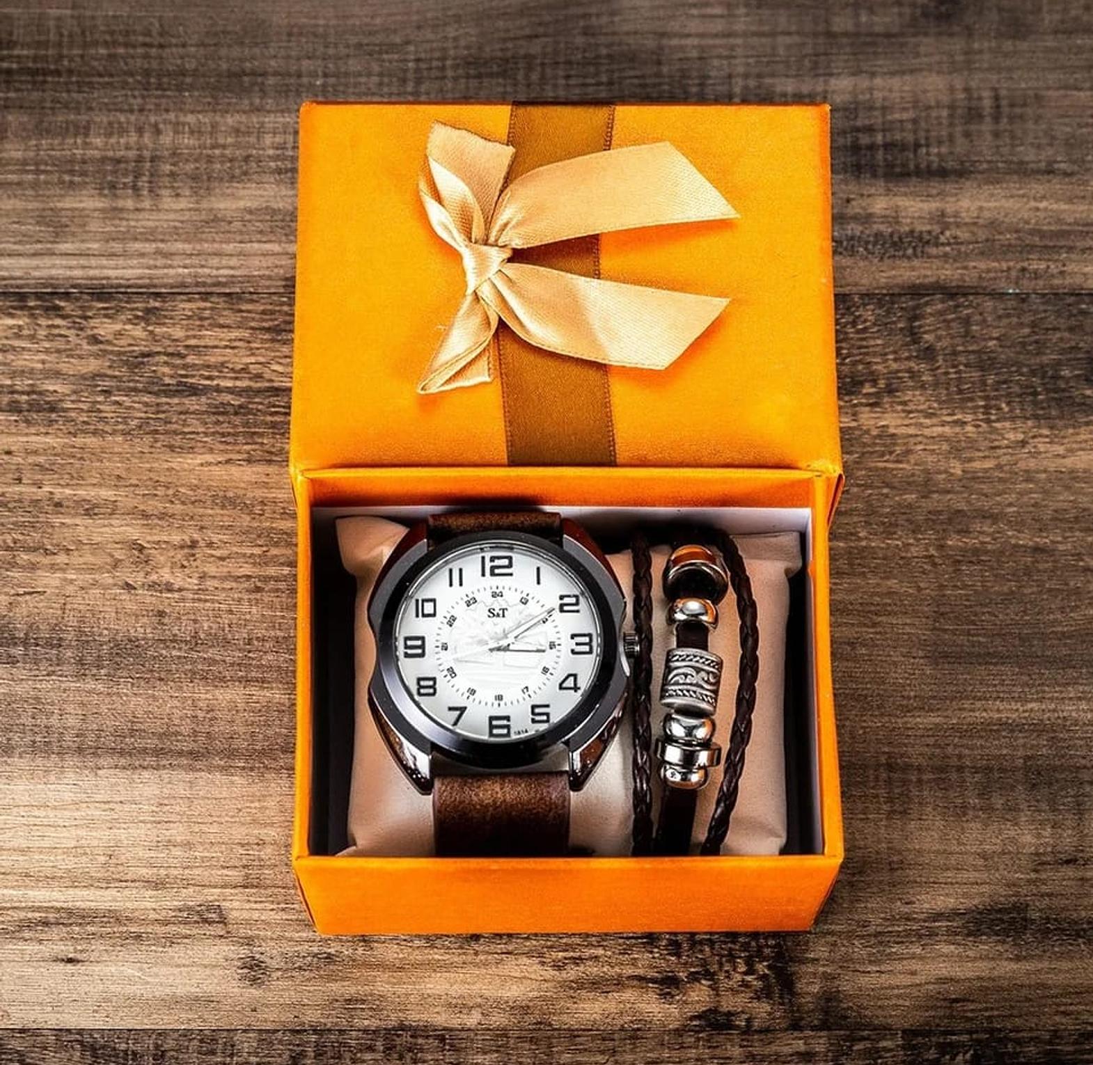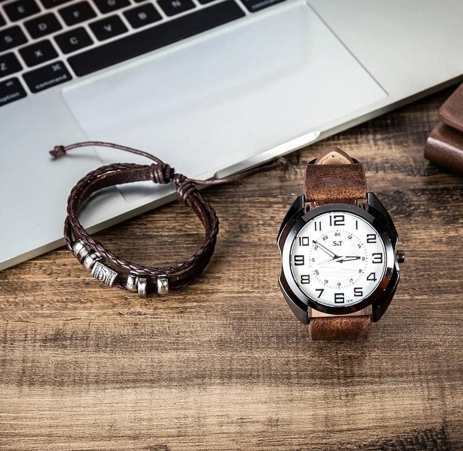 This expertly paired accessory set is designed for the modern man who values both precision and rugged elegance. The combination of a classic timepiece and a handcrafted-style bracelet creates a versatile look that transitions effortlessly from the office to weekend outings.
