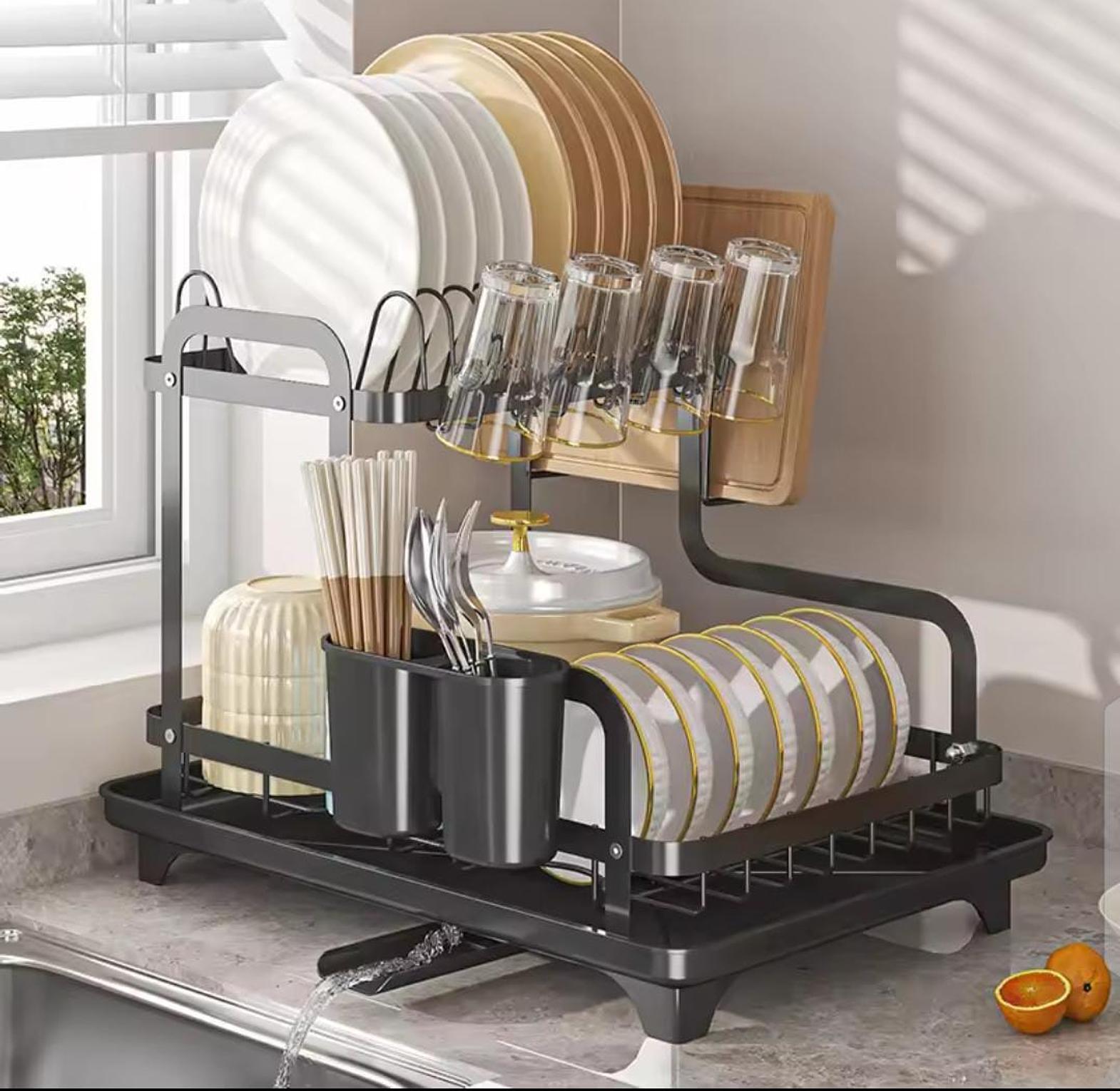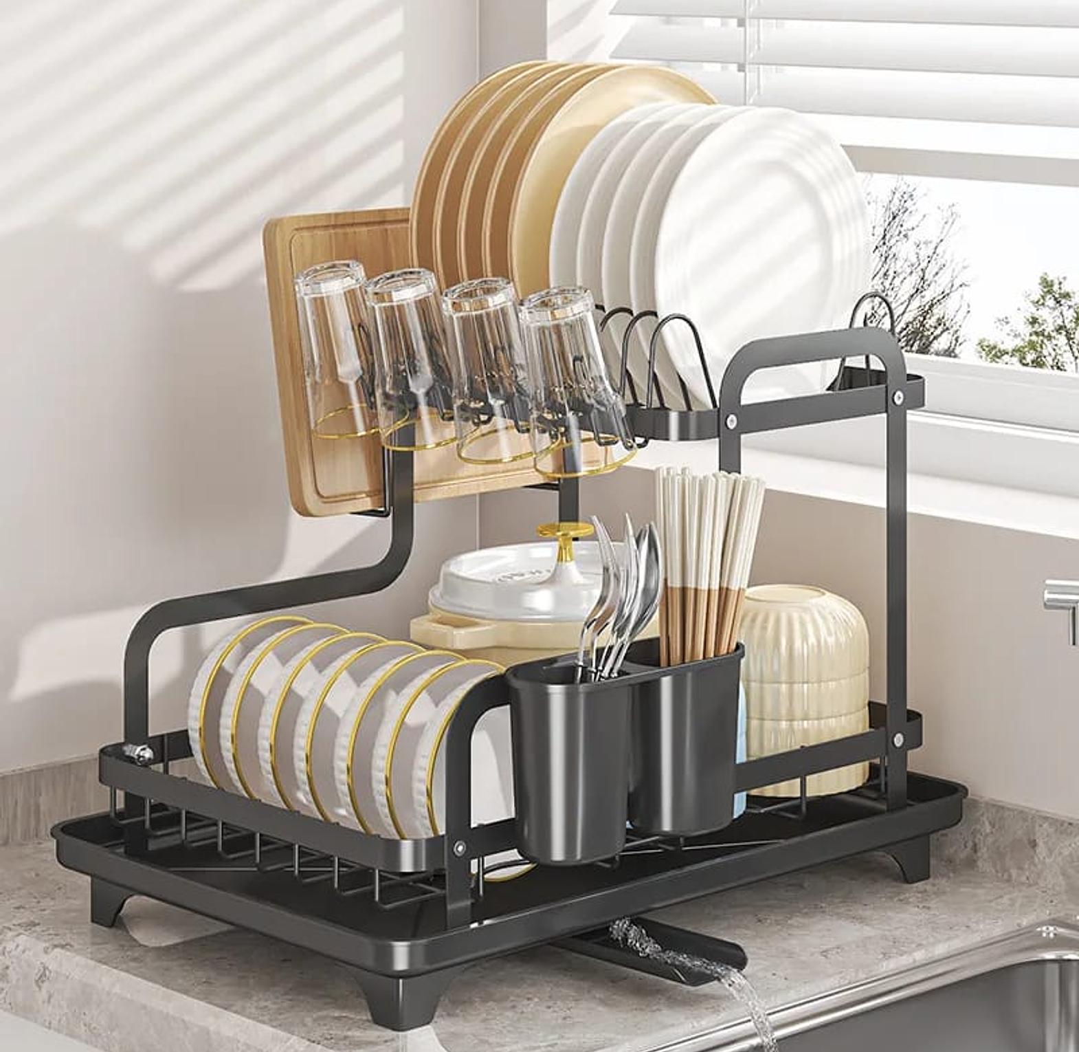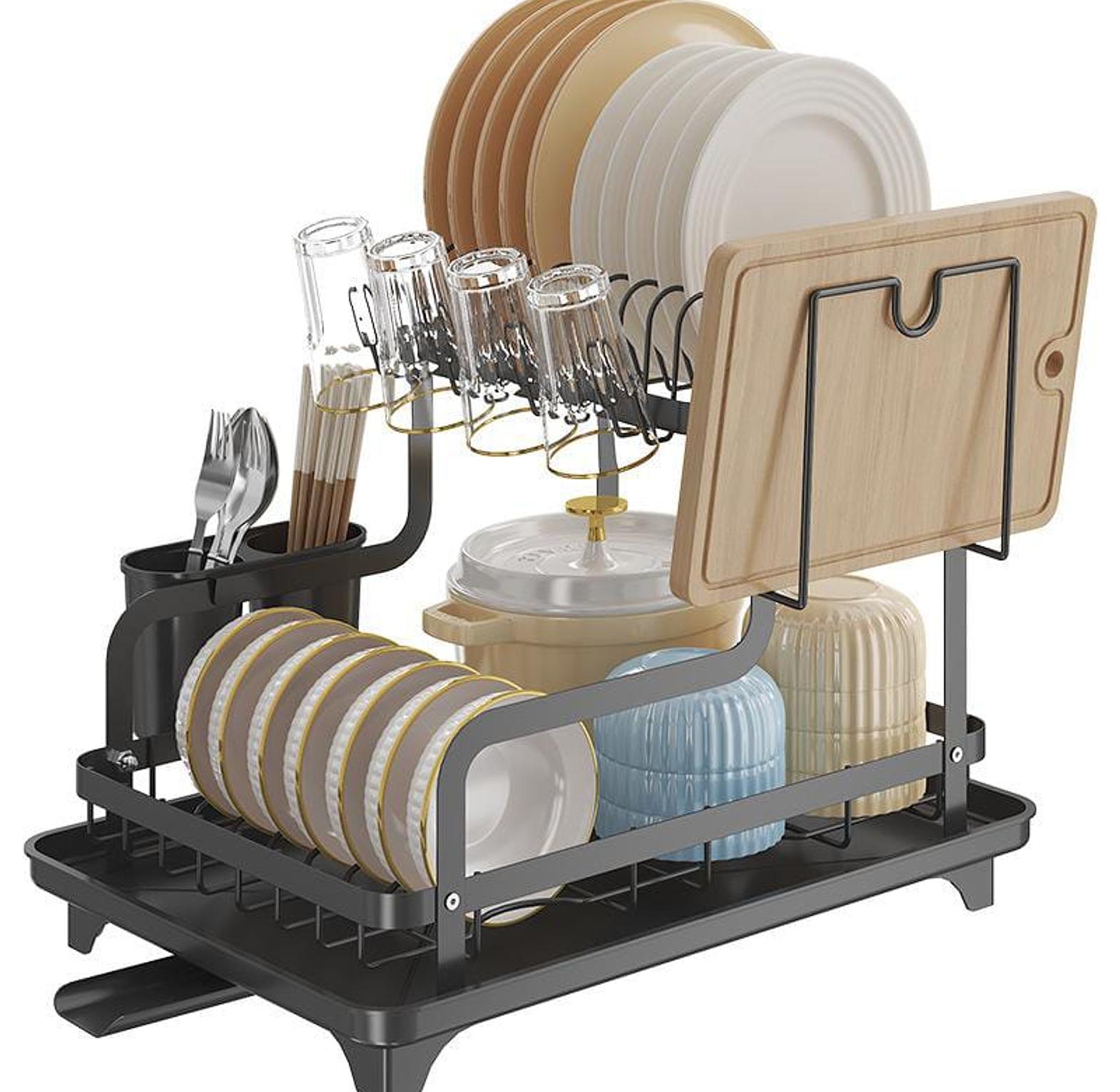 2 Tier Dish Drying Rack Kitchen Organizer Kitchen Countertop Drainer with Drainboard Cups Utensil Cutting Board Holder