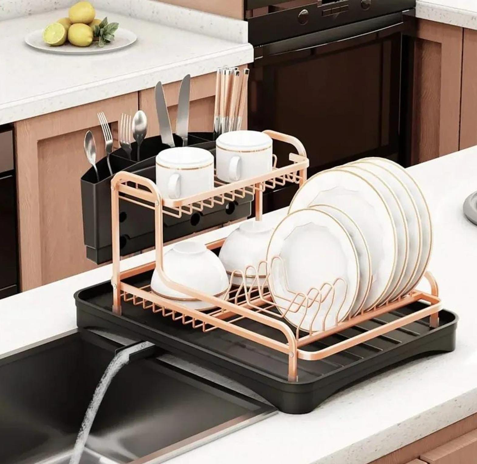 A sleek gold aluminum kitchen dish drying rack designed to neatly organize plates, cutlery, and utensils while allowing water to drain efficiently.