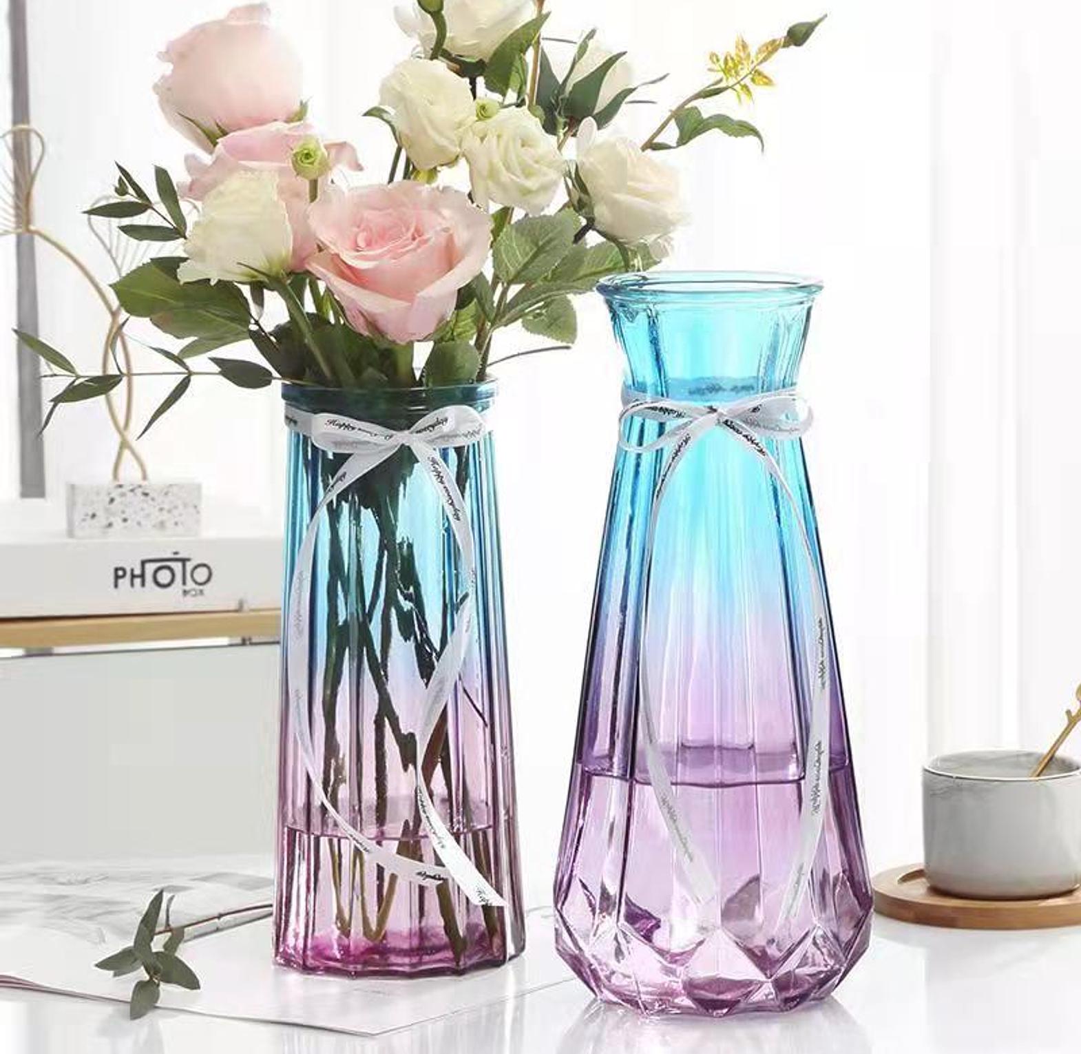 Enhance your home with this stunning Nordic-style glass vase, designed with a modern geometric faceted base and a beautiful color gradient. This luxurious decor piece features a narrow neck and a flared rim, making it an ideal centerpiece for fresh floral arrangements or as a standalone accent on any tabletop.