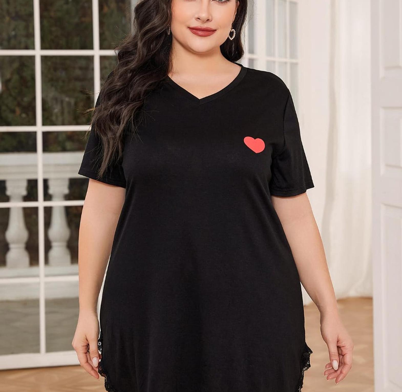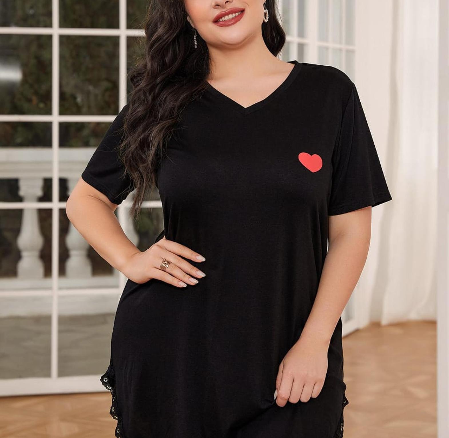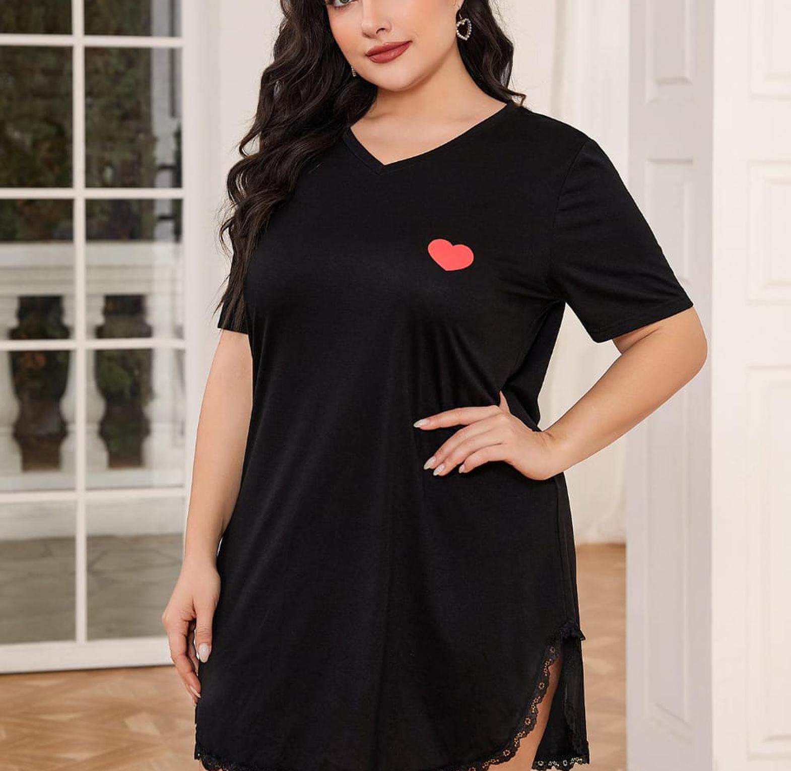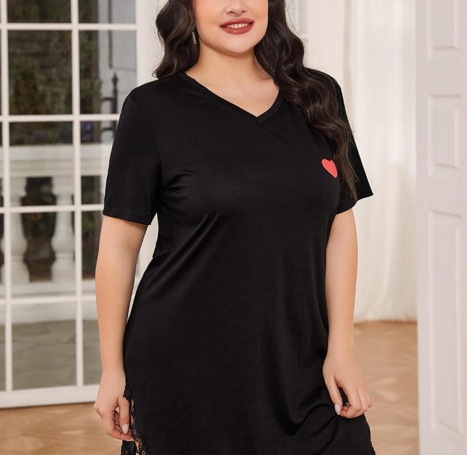 Plus Size Women's Nightgown Lace Hem Sleepwear V Neck Short Sleeves Nightdress Heart Print Pajamas Dress Side Split Nightwear