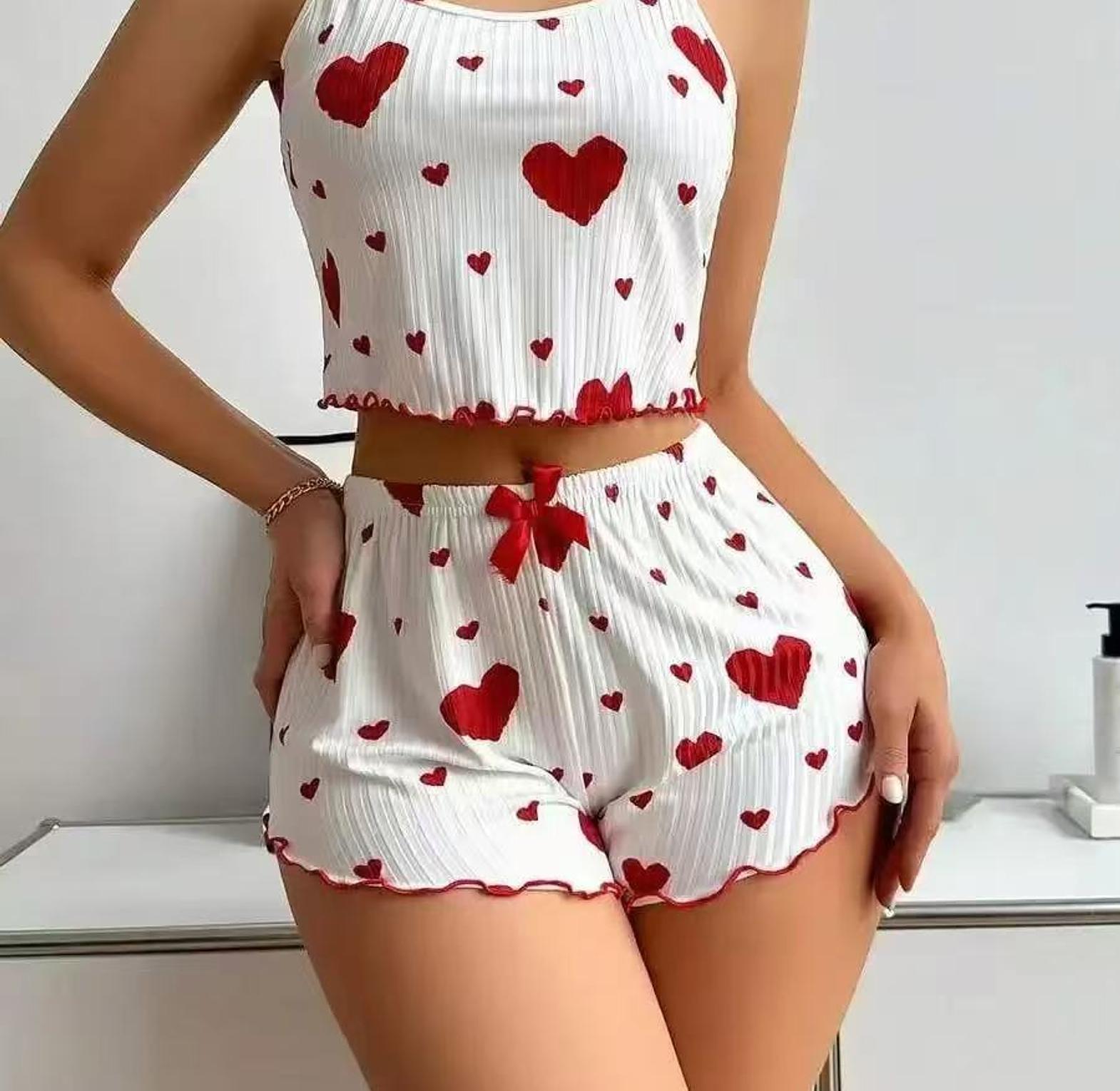 Summer Sleepwear Women Heart Print Relaxed Fit Pajama Set Round Neck Backless Crop Cami Top and Shorts Set Loungewear