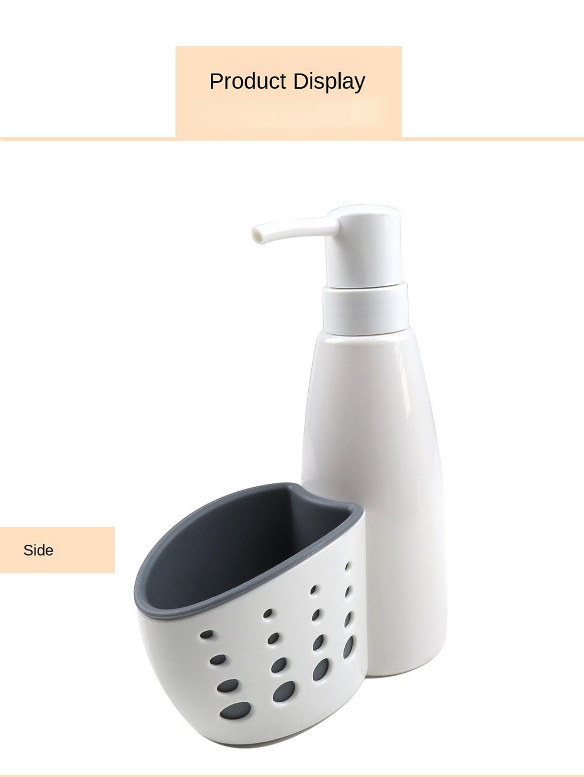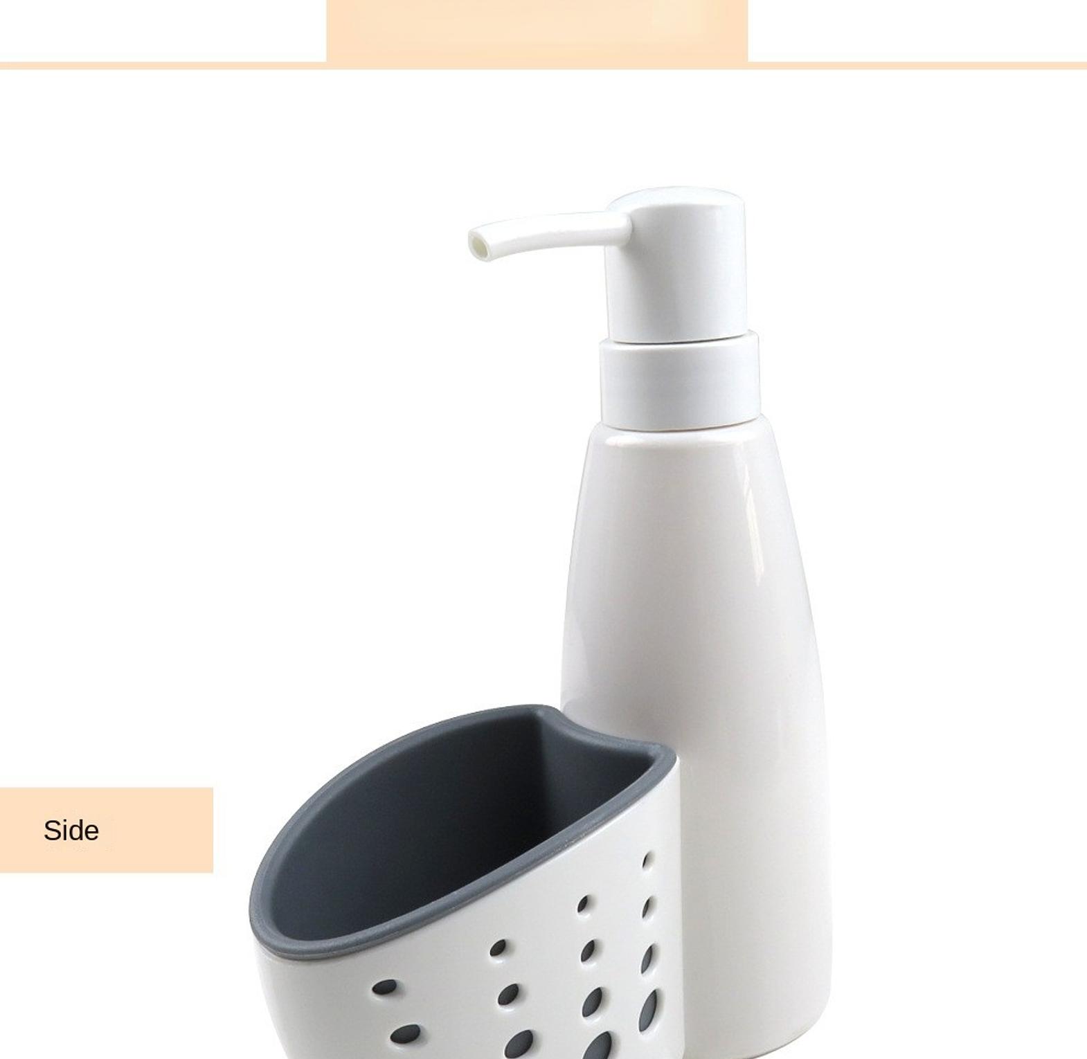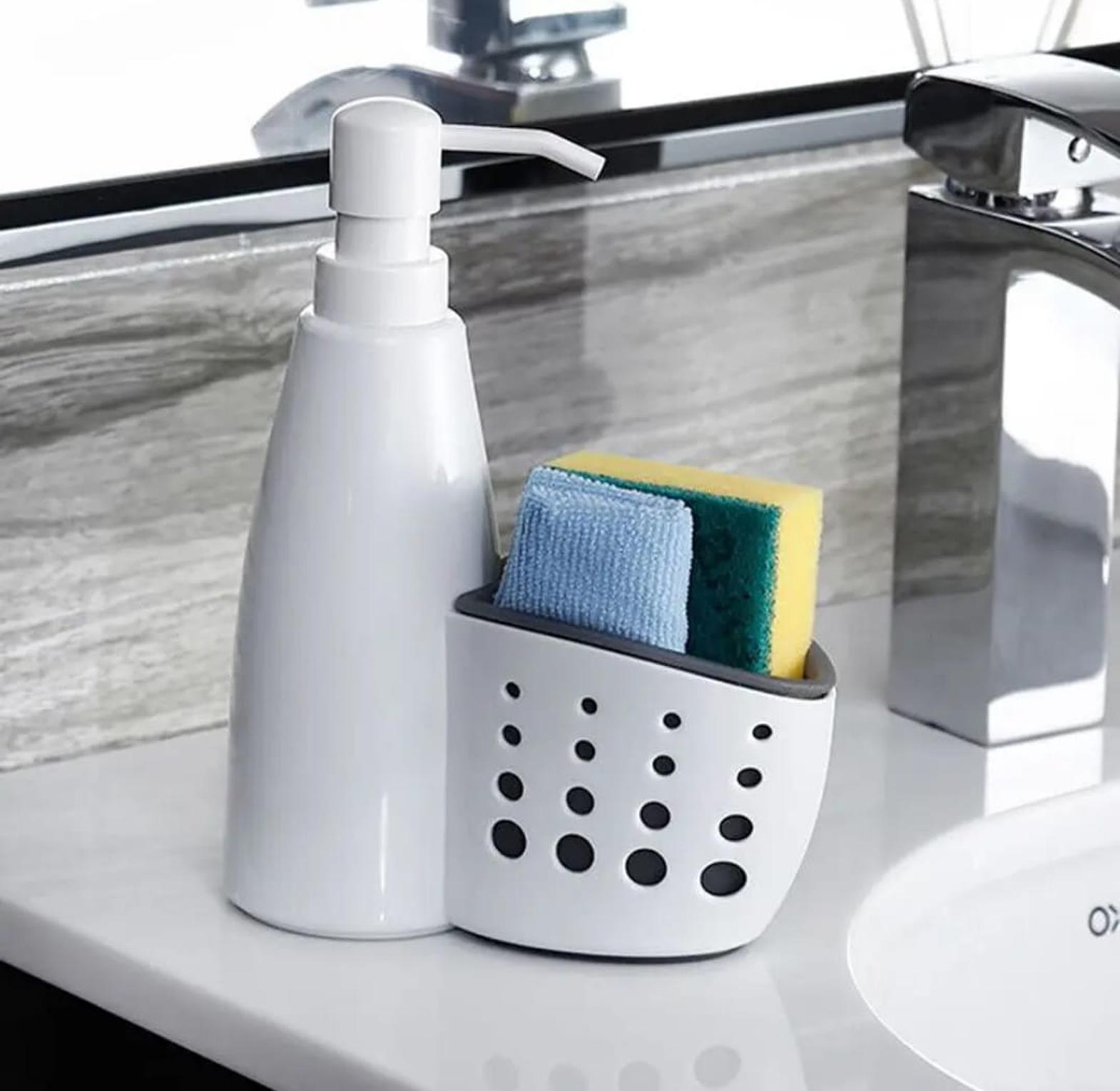 It combines a liquid detergent dispenser with a storage compartment for sponges, brushes, and cleaning tools.