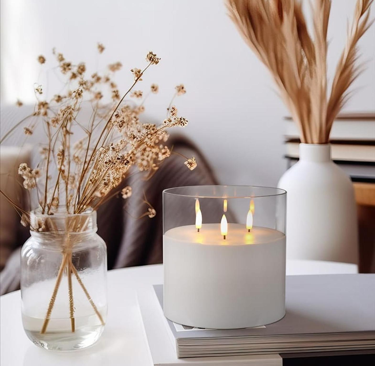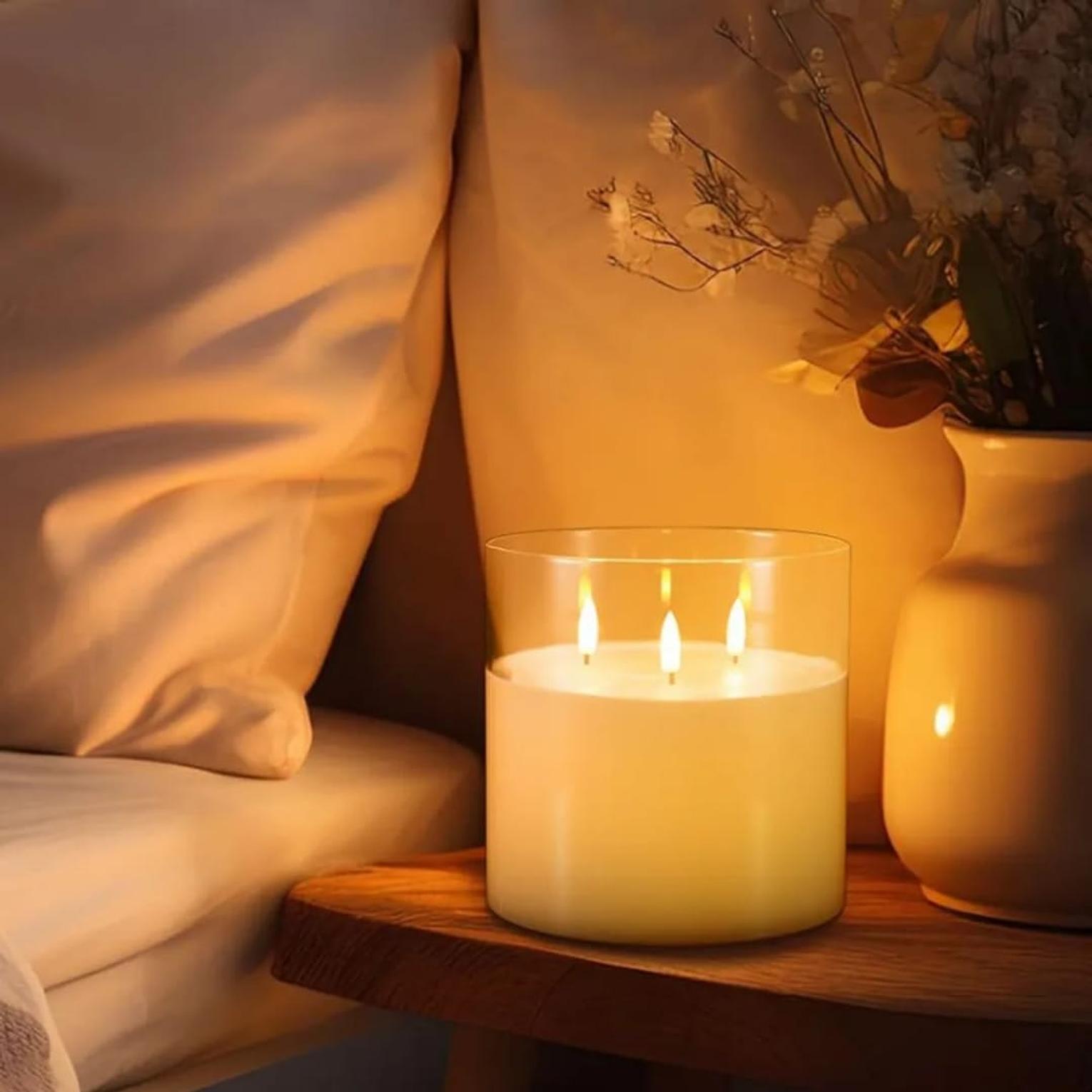 It features a realistic 3-wick design inside a premium glass holder, creating a luxurious decorative appearance.