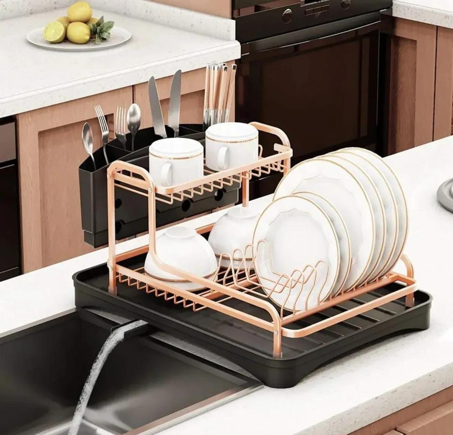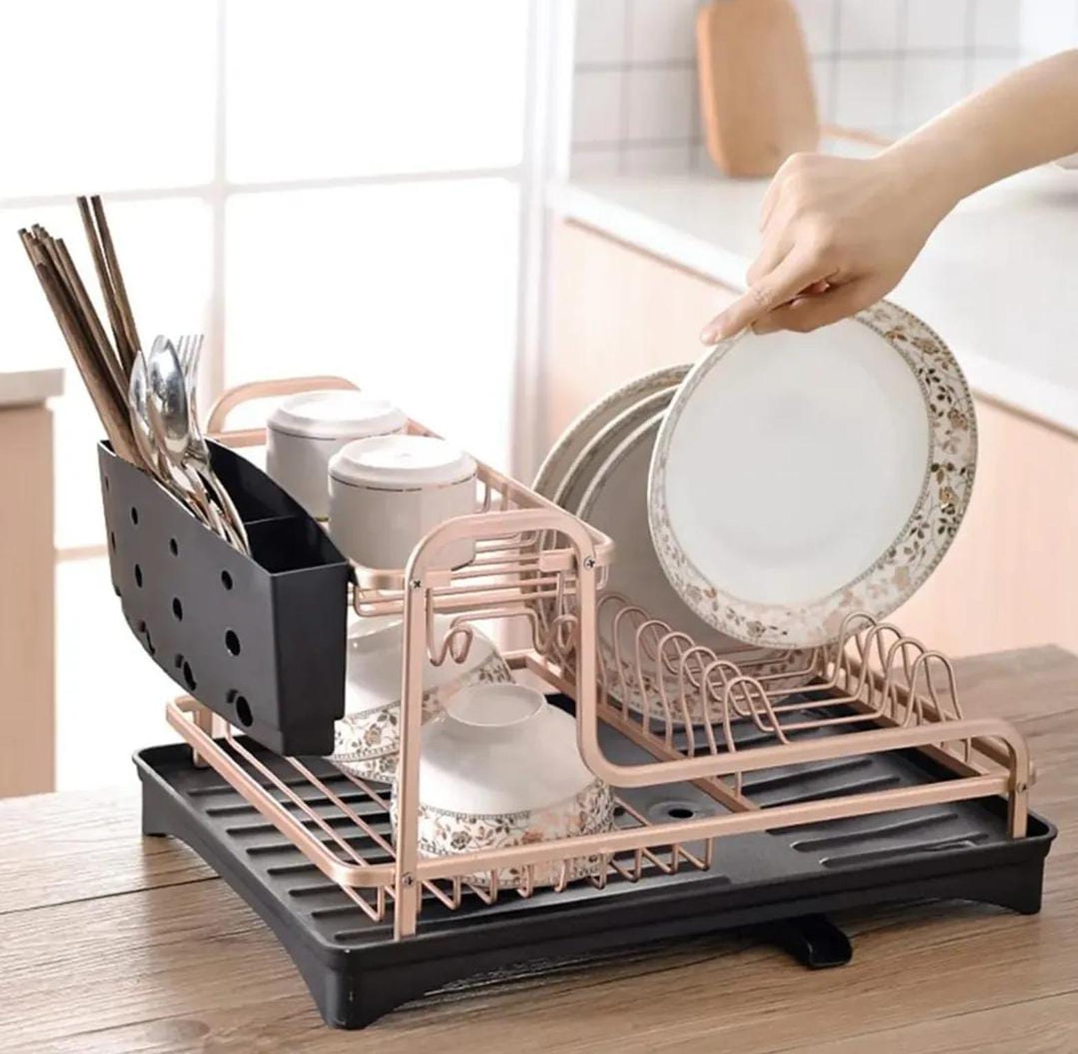 A sleek gold aluminum kitchen dish drying rack designed to neatly organize plates, cutlery, and utensils while allowing water to drain efficiently.