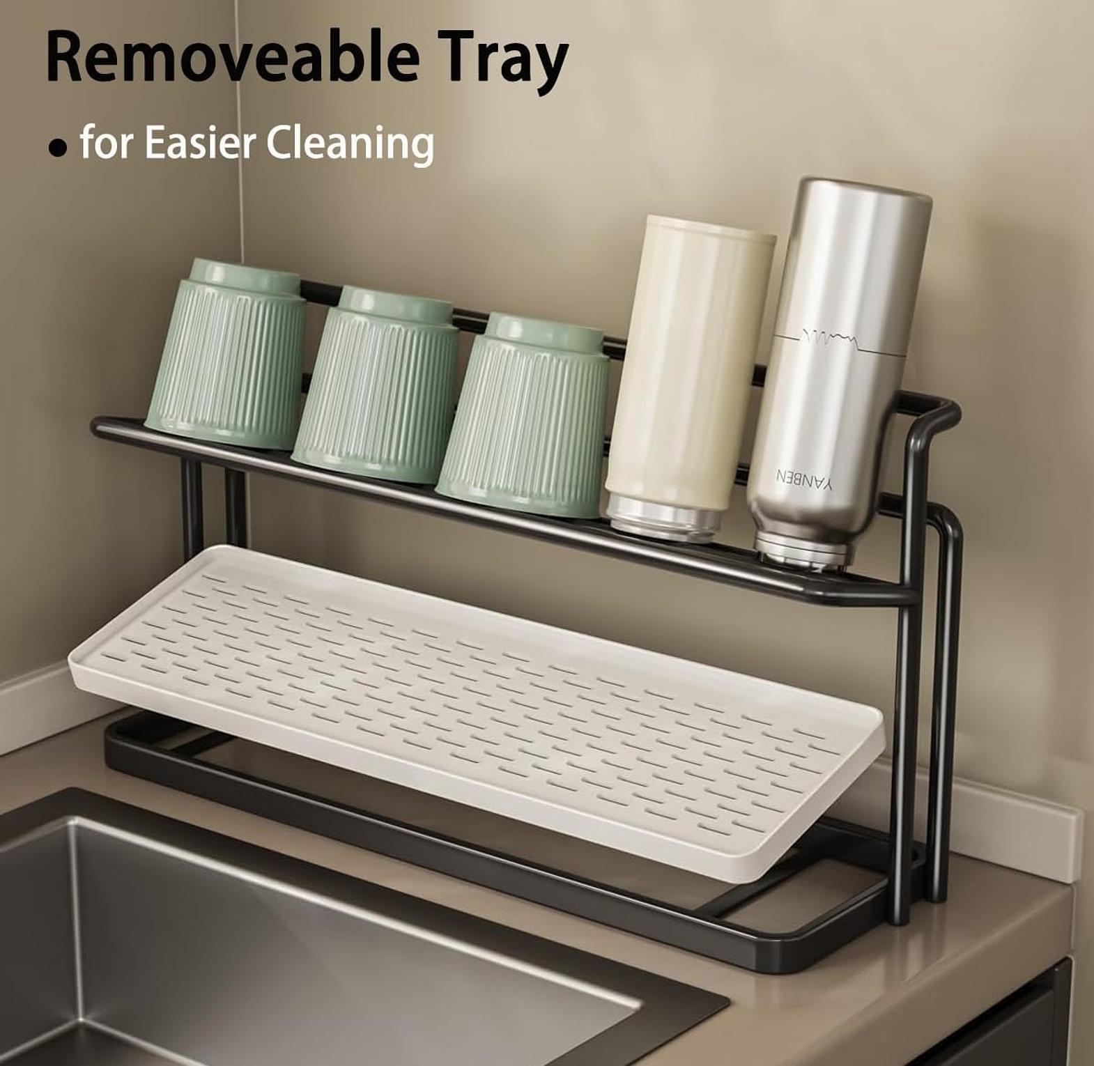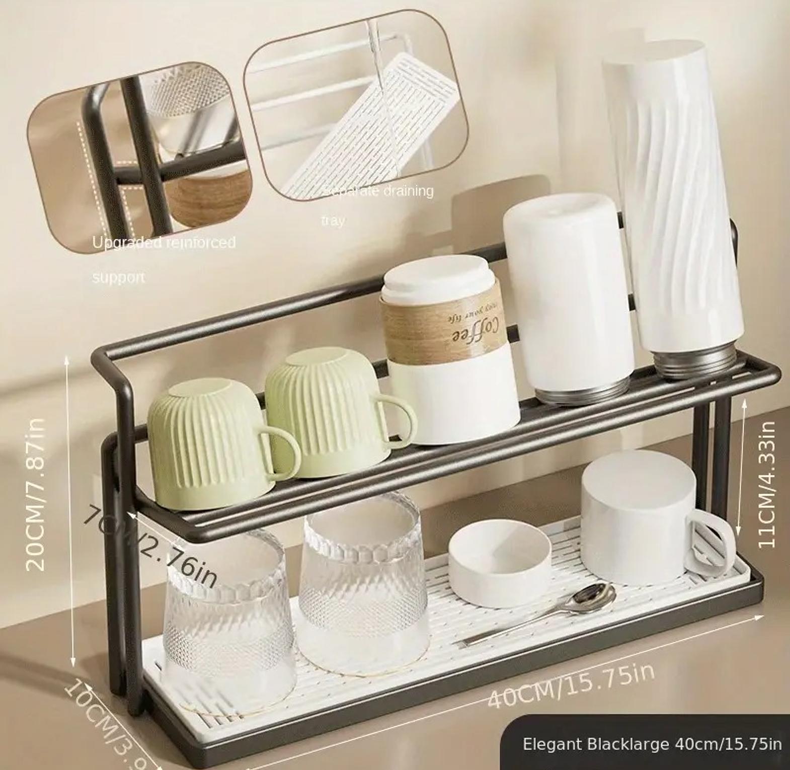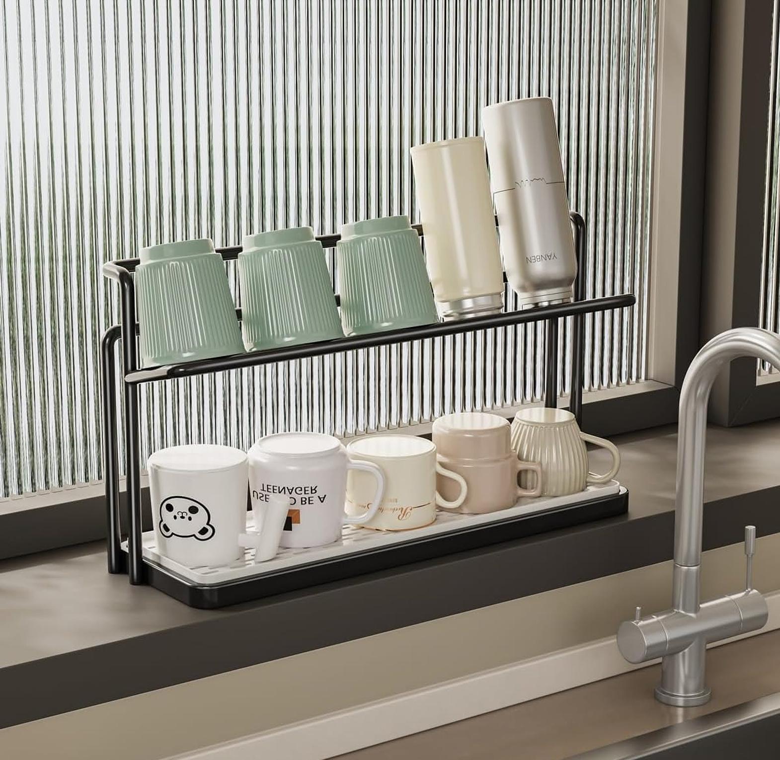 A compact double-layer kitchen storage rack with an integrated cup holder designed to maximize countertop space and improve organization.