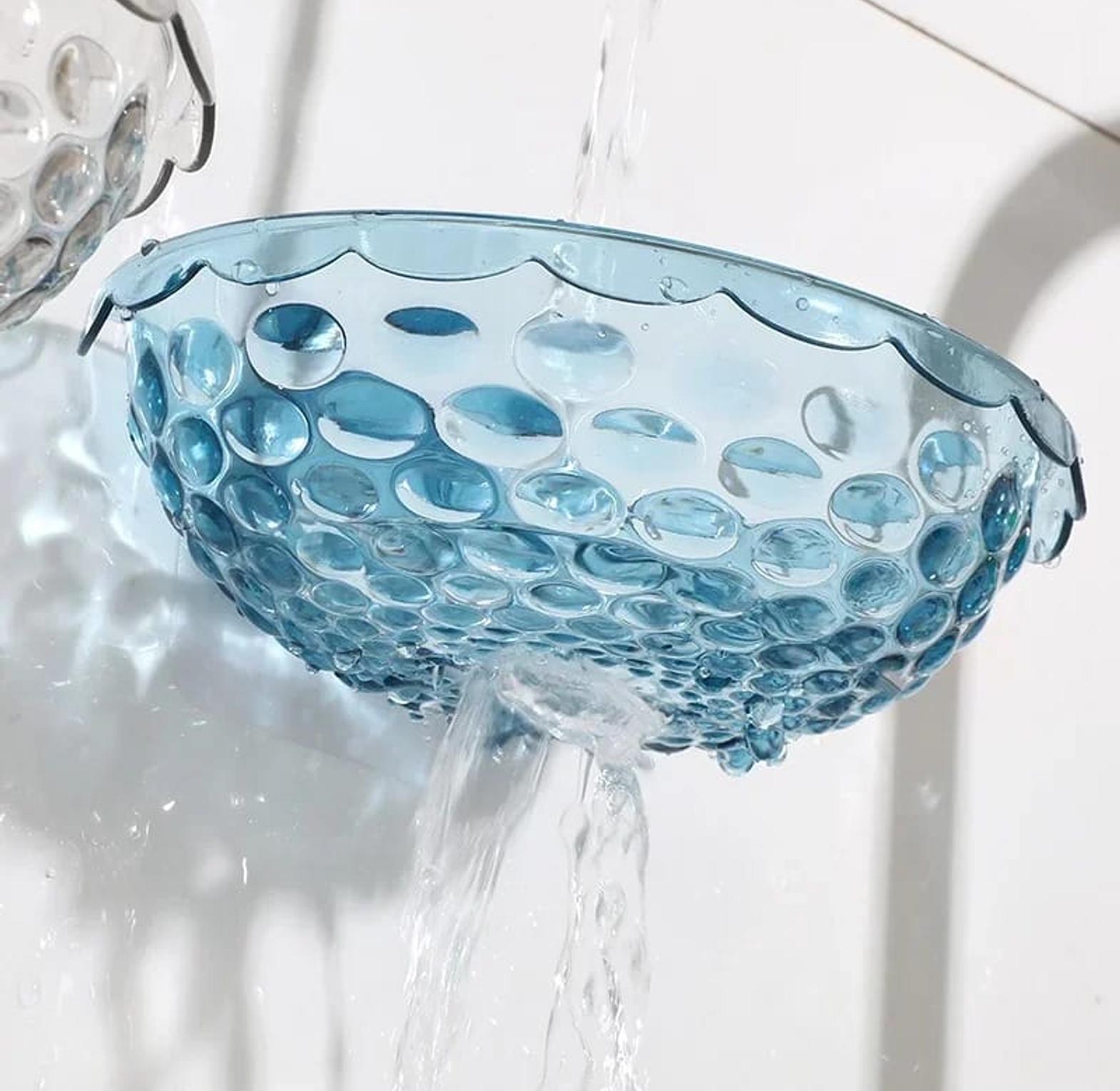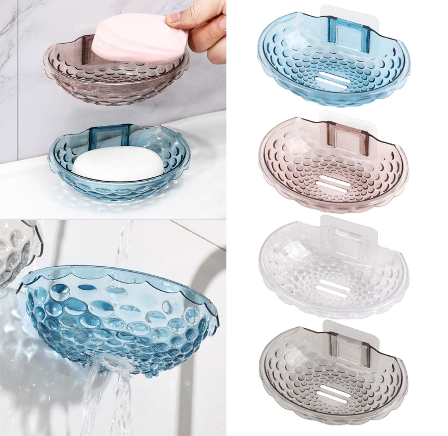 A clear acrylic wall-mounted soap dish with self-adhesive installation and drainage design for clean, dry, and organized bathroom storage.